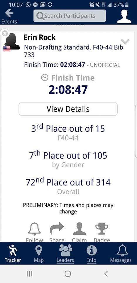 As far as my race, I was in a very tough age group. Despite being 7th overall with a 2:08, I could only swing third in the women’s 40-44 age group. I was pretty consistent across the three legs, with my bike being slightly better than my runs as usual.