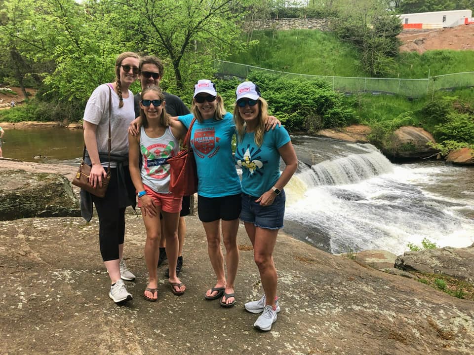 After packet pickup. we headed to Sidewall Pizza with our other friend Sally and her mom, and then walked down to check out Falls on the Reedy park. The sun had miraculously appeared, and the flowers were in full bloom. The waterfalls were spectacular, and everything was so walkable, Kids, dogs, couples and athletes were all milling about. What a great destination!